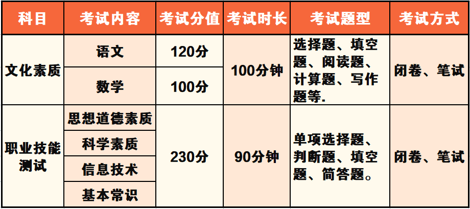 (三)考试内容:文化素质考试+技能测试,总分450。